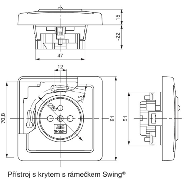 Zásuvka ABB v bílé barvě v designu Swing / Swing L (dle zvoleného rámečku). Vestavná hloubka 22 mm. Pouze pro interní použití.