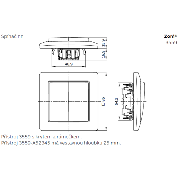 Bezšroubový vypínač ABB 3559-A01345 řazení 1 Upevnění šrouby. Bezšroubové svorky (pro vodiče 1-2,5..